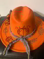Custom hand-burned leaves, pumpkin and acorns adorned with a blue ribbon, colorful cord and an acorn arrangements. Also has the phrase "Autumn Leaves and Pumpkins Please" burned on the inside bottom brim. Inside band has a ribbon to adjust to most smaller head sizes. One size fit most.
