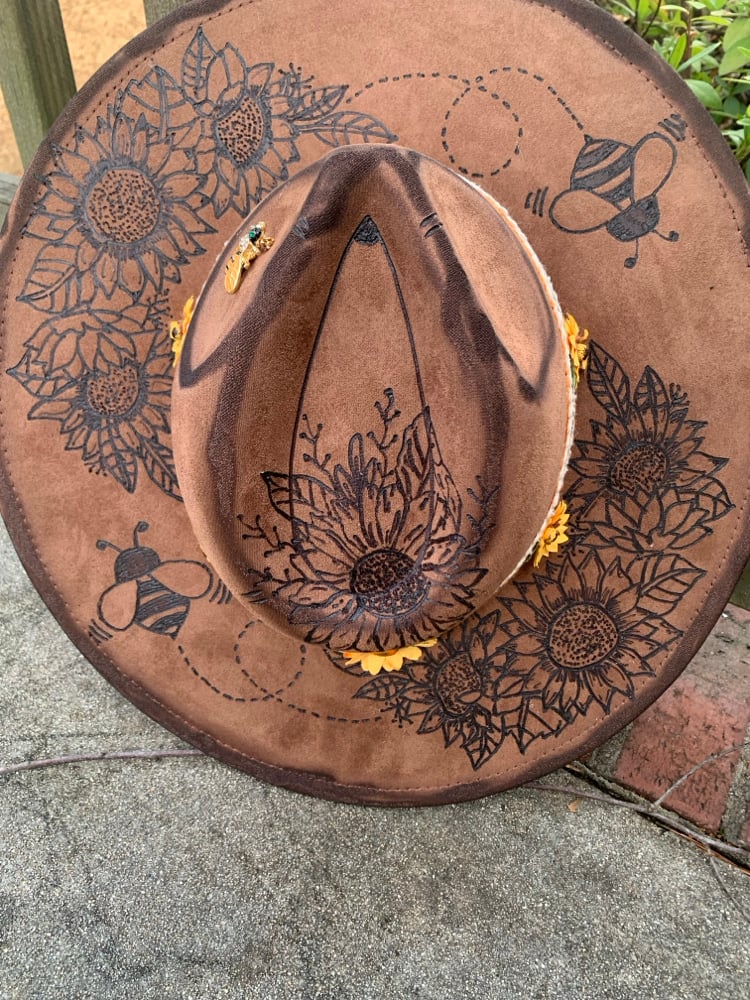Custom hand-burned Bees and Flowers design adorned with orange, green and beige ribbons, sunflowers, and a bee pin. With "The Way. The Truth. The Life" phrase burned to the bottom brim. Inside band has a ribbon to adjust to most smaller head sizes. One size fit most.