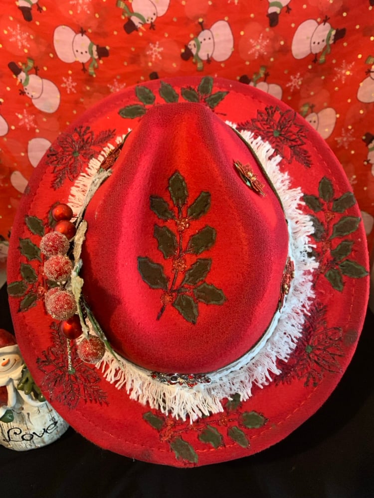 Custom hand-burned and painted hat with holly leaves and poinsettia flowers, adorned with a Merry Christmas patch, a holly and red berries arrangement an antique Victorian vintage Christmas wreath brooch. Also has the phrase "Joy to the World", burned on the inside bottom brim. Inside band has a ribbon to adjust to most smaller head sizes. One size fit most.