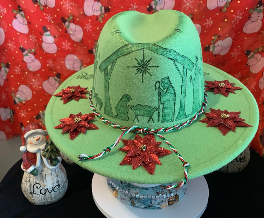 Custom hand-burned hat with the Nativity Scene, adorned with poinsettia's flower embellishments a Merry Christmas patch, a Red, White and Green cord and an antique Victorian vintage Christmas wreath brooch. Also has the phrase "Emmanuel, God with Us" based on Matthew 1:23 Bible verse, burned on the inside bottom brim. Inside band has a ribbon to adjust to most smaller head sizes. One size fit most.