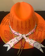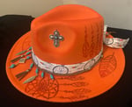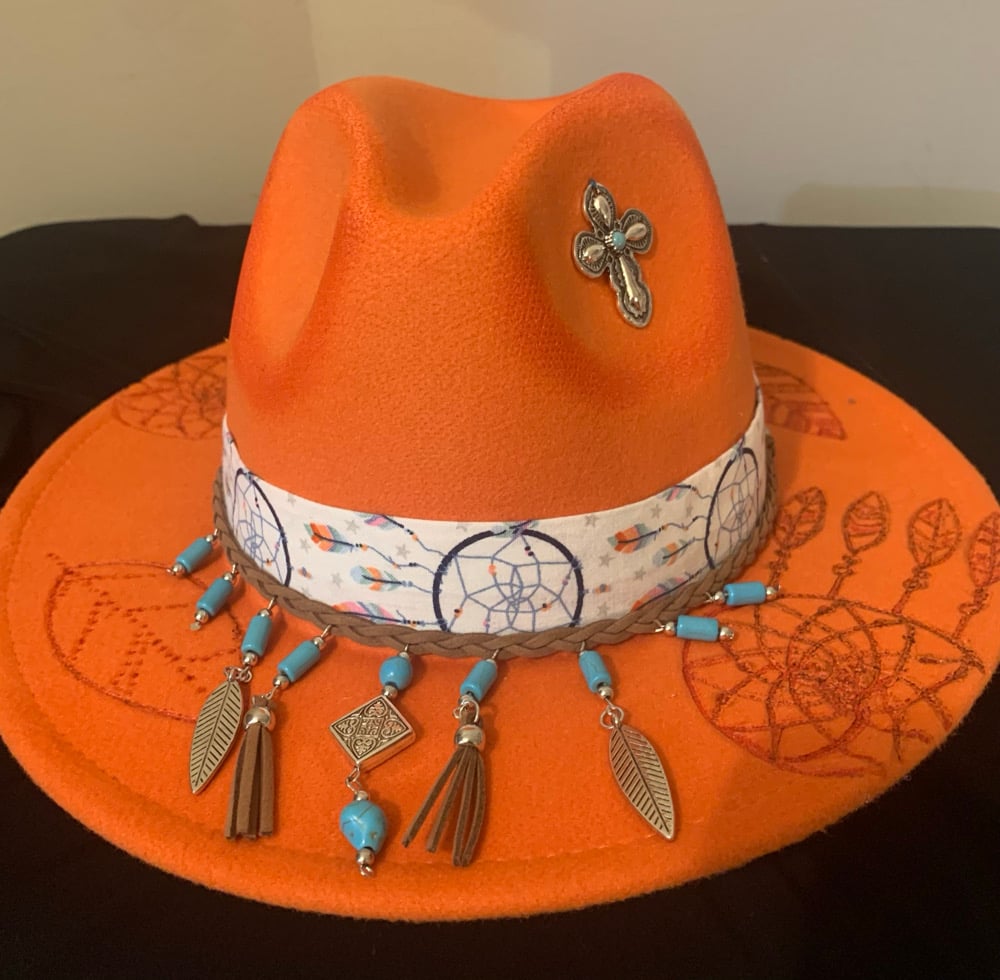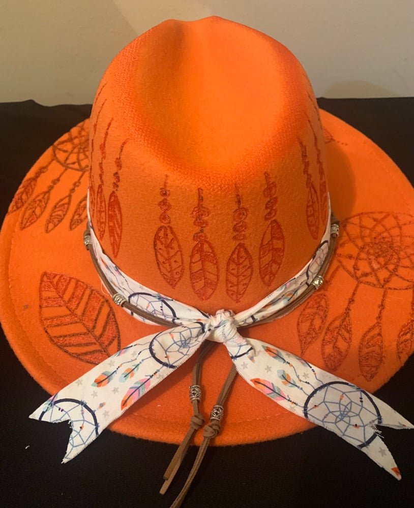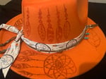Custom hand-burned dreamcatcher design with dreamcatcher ribbon, feather necklace and a silver with teal cross accents with "Faith is my Dreamcatcher" burned on the inside bottom brim. Inside band has a ribbon to adjust to most smaller head sizes. One size fit most.