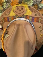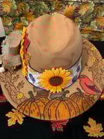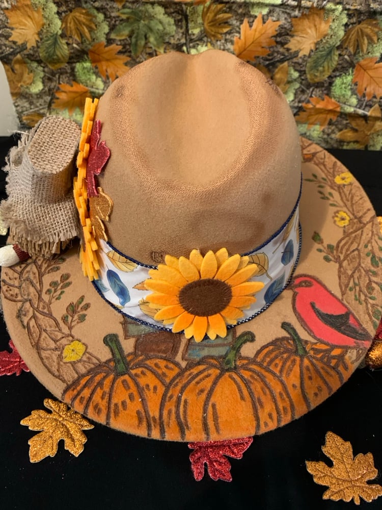 Custom hand-burned and painted hat with a Scarecrow, pumpkin and bird adorned with a leaves ribbon, a scarecrow head, leaves and sunflower patches. Also has the phrase "Fall into His Blessings" burned on the inside bottom brim. Inside band has a ribbon to adjust to most smaller head sizes. One size fit most.