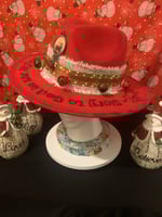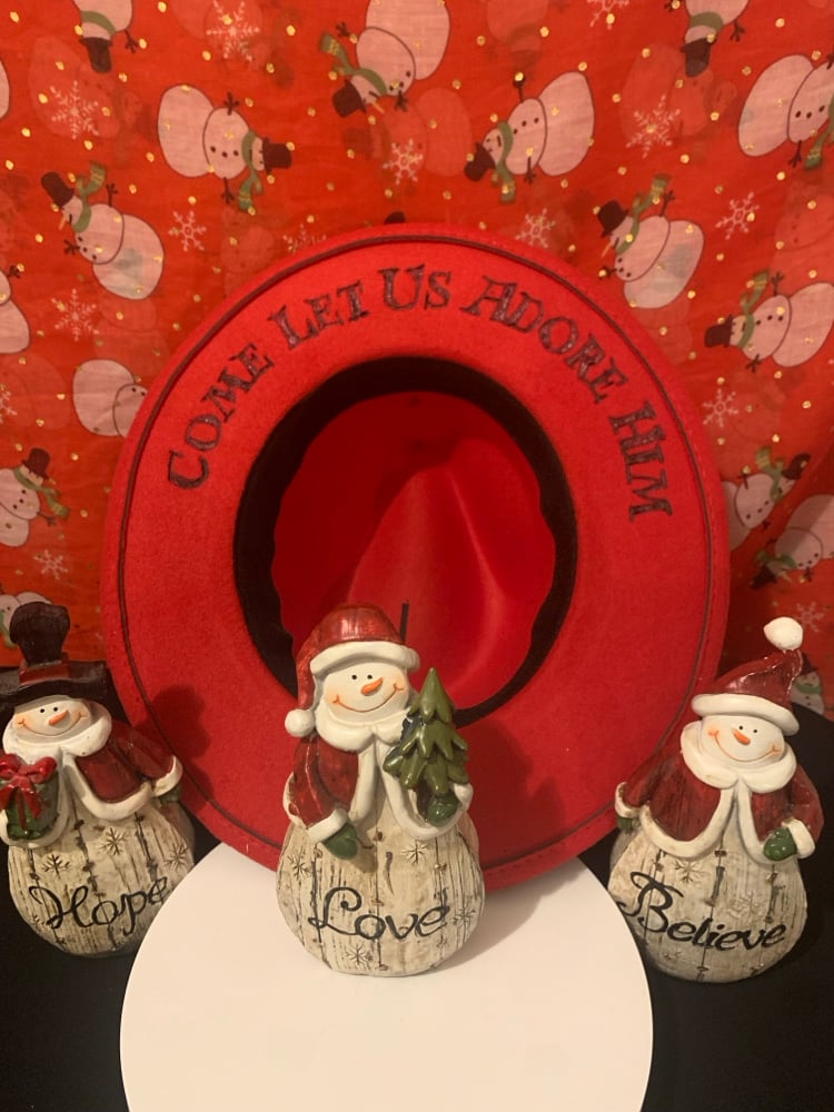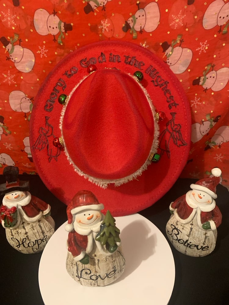 Custom hand-burned with the phrase "Glory to God In The Highest" Bible verse from Luke 2:14. Hat is adorned with ribbons, jingle bells and a vintage Santa brooch. Also has the phrase "Come Let Us Adore Him", burned on the inside bottom brim. Inside band has a ribbon to adjust to most smaller head sizes. One size fit most.