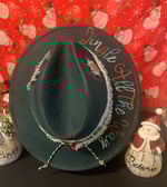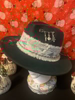 Custom hand-burned Christmas Hat with Jingle all the Way design with Christmas trees ribbon and red, white, green cord adorned with a safety pin with a Christmas tree, a snowman and a candy cane charm on one side and a snowflake brooch on the other side. Also has the phrase "Merry Christmas", burned on the inside bottom brim. Inside band has a ribbon to adjust to most smaller head sizes. One size fit most.