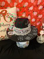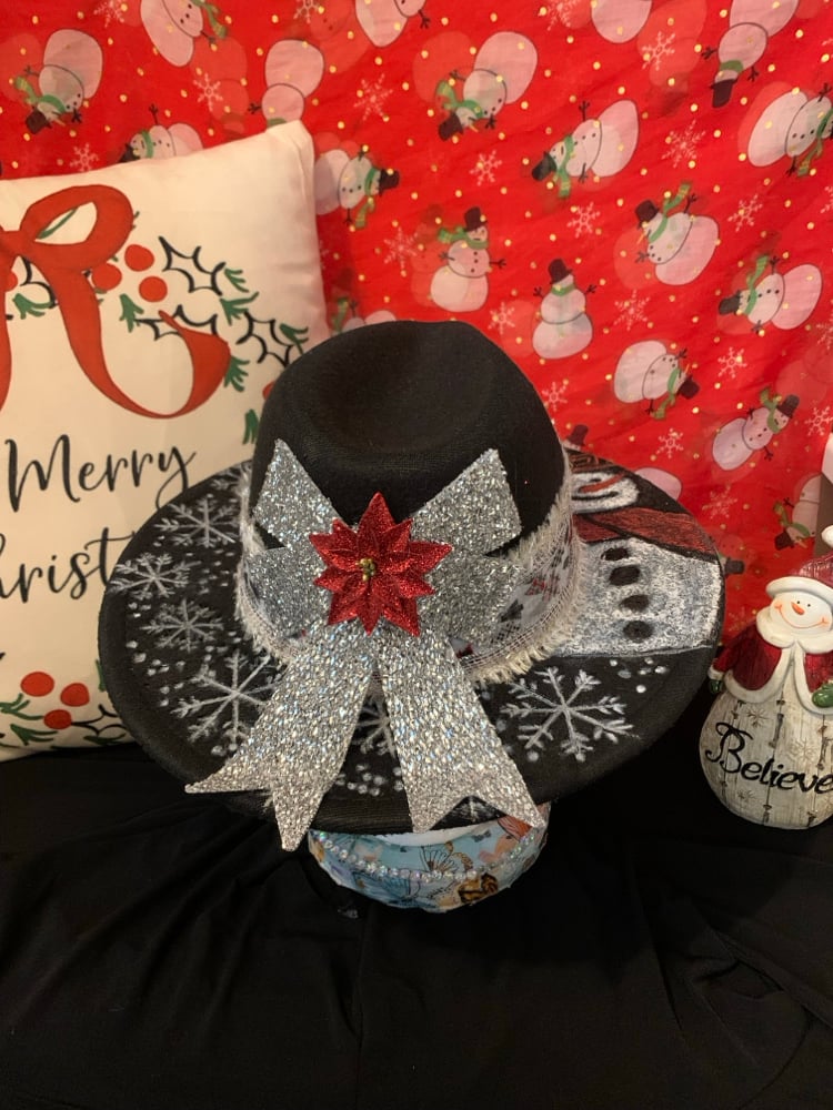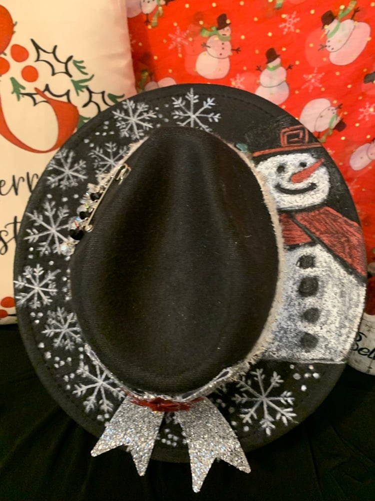 Custom hand-burned Snowman & Snowflakes design, adorned with Christmas theme ribbons, a safety pin with snowman charms and a silver bow embellishment with a red poinsettia flower. Also has the phrase "Let It Snow", burned on the inside bottom brim. Inside band has a ribbon to adjust to most smaller head sizes. One size fit most.