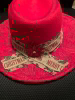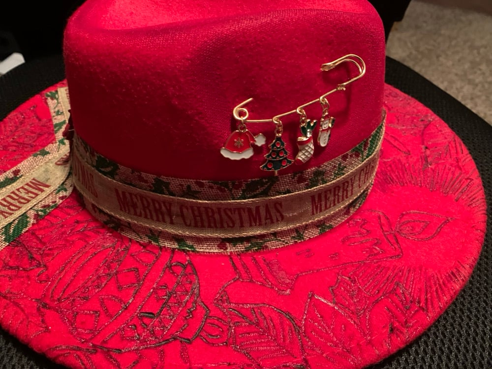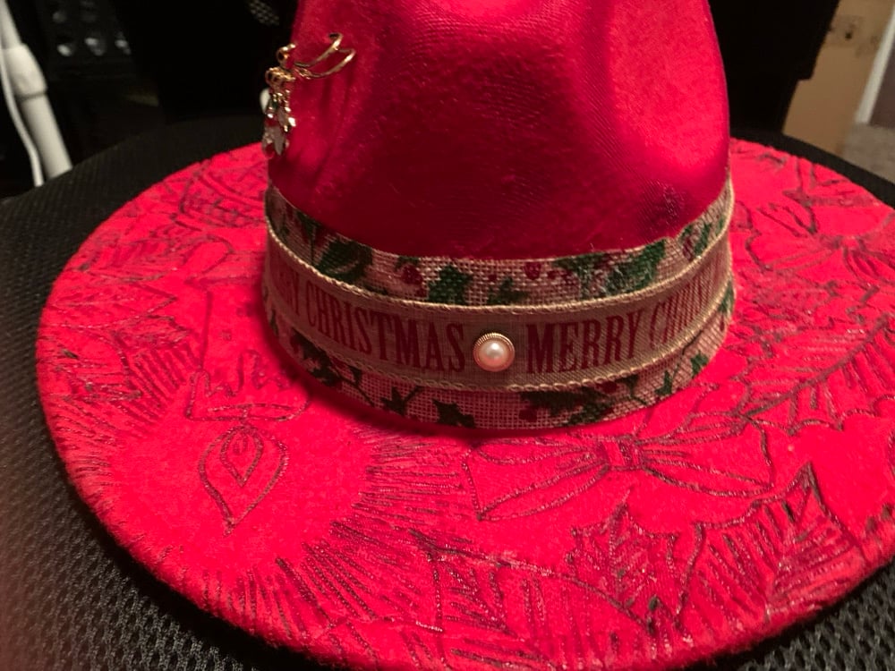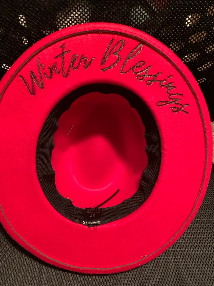 Custom hand-burned Candle design, ornament and bow adorned with Christmas theme ribbons, a safety pin with Christmas charms and a poinsettia embellishment. Also has the phrase "Winter Blessings", burned on the inside bottom brim. Inside band has a ribbon to adjust to most smaller head sizes. One size fit most.
